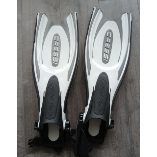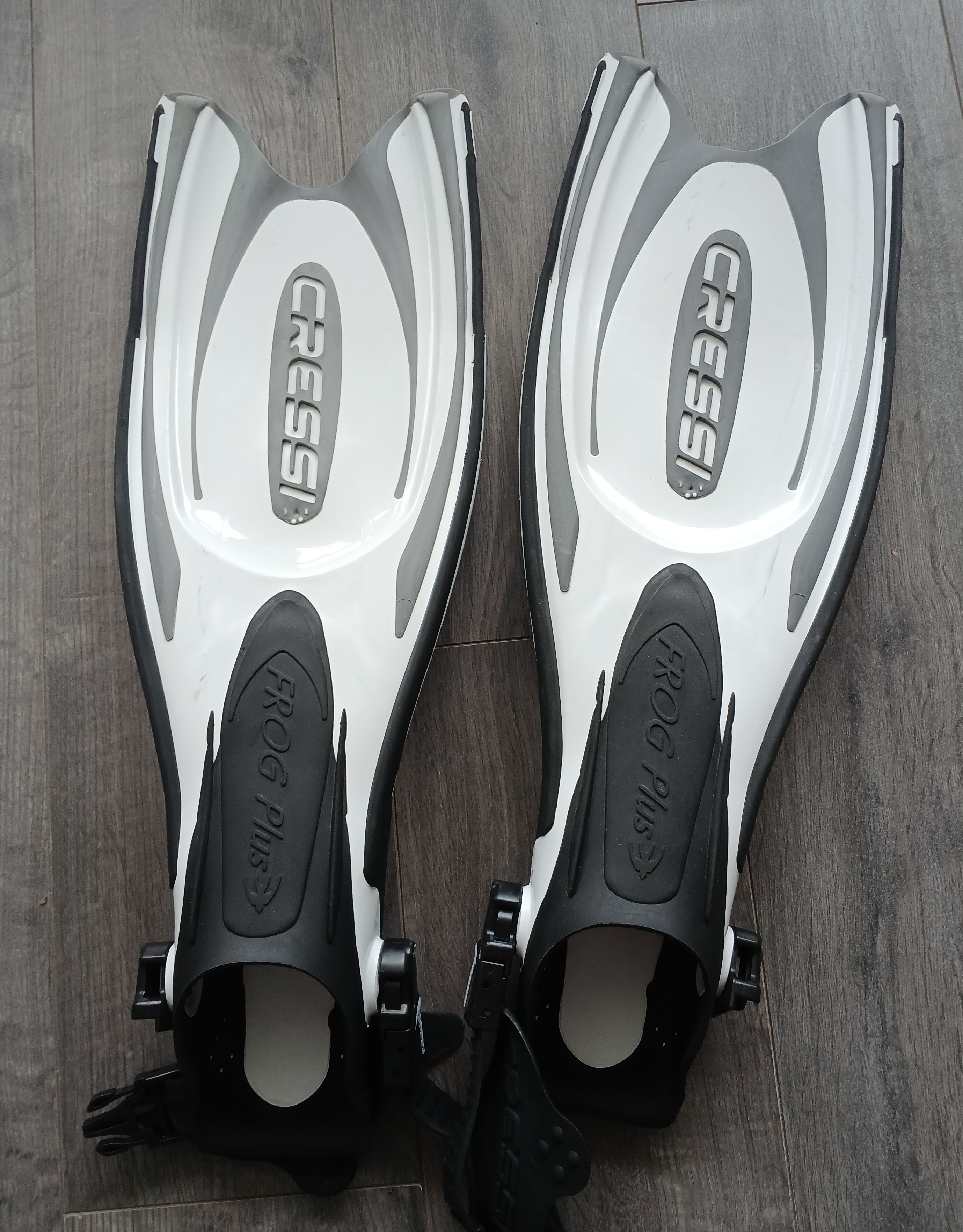 Vends palmes réglables blanches CRESSI FROG PLUS, taille S/M, état quasi neuf.
